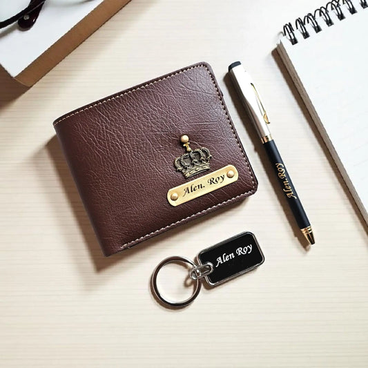 Personalised Men's Wallet, Metal Keychain & Premium Pen